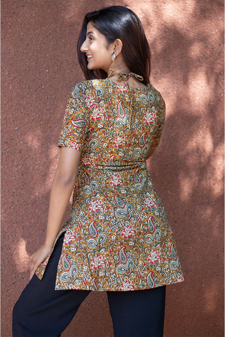 Cotton Top Halter Tie with Overall Bell Print Half Sleeves Elevate your casual wardrobe with this versatile cotton top featuring a flattering halter tie neckline and charming bell print design. Crafted from breathable cotton fabric, this piece offers comfort for everyday wear while the half sleeves provide an ideal balance for warm weather styling. The halter tie closure allows for adjustable fit and adds a contemporary touch to the classic silhouette. Perfect for pairing with jeans, skirts, or shorts, this top transitions seamlessly from day to evening occasions. The overall bell print adds visual interest and movement to your look, making it a standout addition to your seasonal collection.