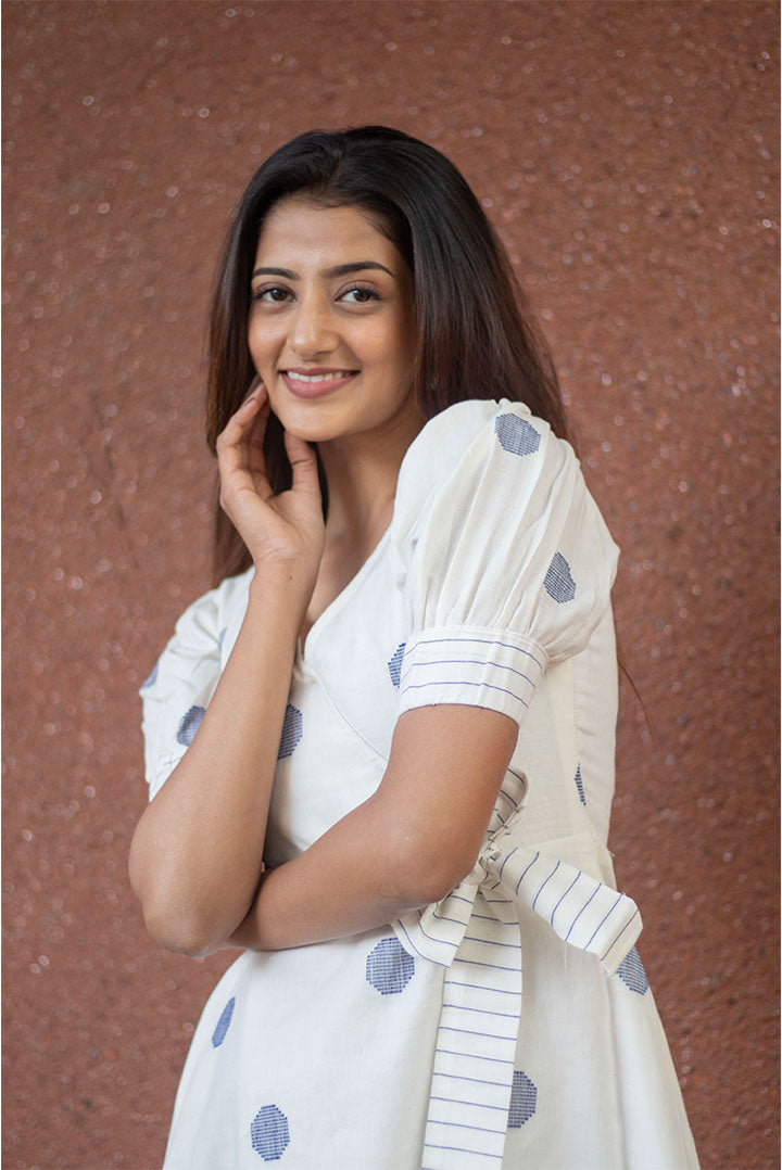 Elevate your wardrobe with this sophisticated White Achklan Style Dress, crafted from premium cotton flex fabric for all-day comfort and movement. The refined V-neckline frames the face beautifully, while hand-loom butta detailing adds artisanal charm and texture. A single functional pocket provides practical elegance, complemented by a graceful flare silhouette that flatters every frame. Delicate tie-bow details at the waist create a polished finishing touch. Perfect for casual gatherings, work settings, or weekend outings, this versatile piece seamlessly transitions from day to evening wear.